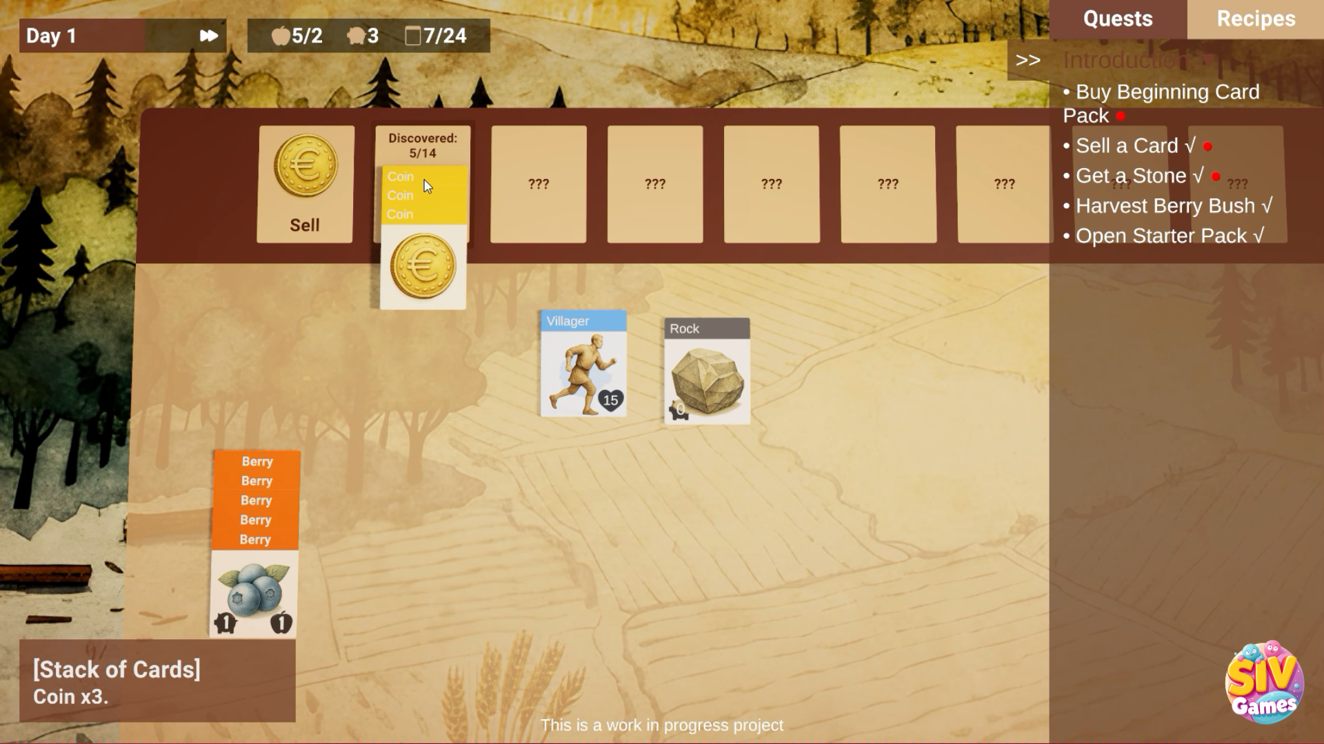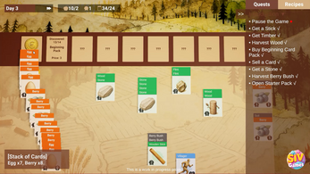 You begin with a small foothold in a living realm ๐ฑ. By dragging village and structure cards onto resource cards, you gather materials, unlock crafting recipes ๐, and grow your settlement.